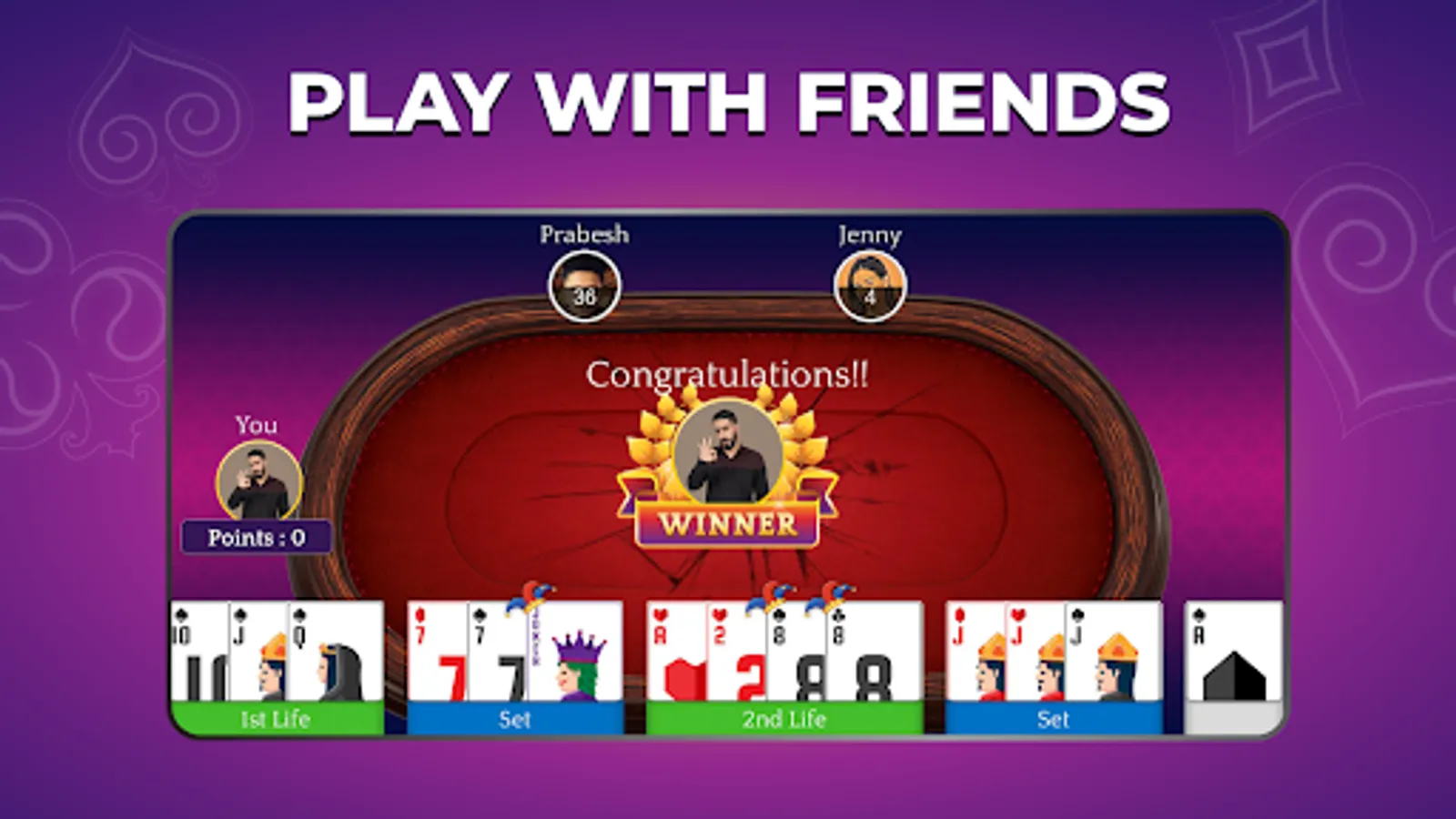 The person with the most points loses, and each extra card is worth its value in points. In this Rummy, a player must have a pure sequence (First Life), another pure or impure sequence (Second Life), and a set of four cards to show or declare a game.