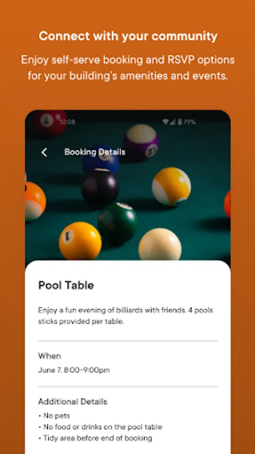 Amenity Bookings: Want to use the new roof-top deck? How about booking some space for a meeting? Easily book the amenities in your building when you need them.