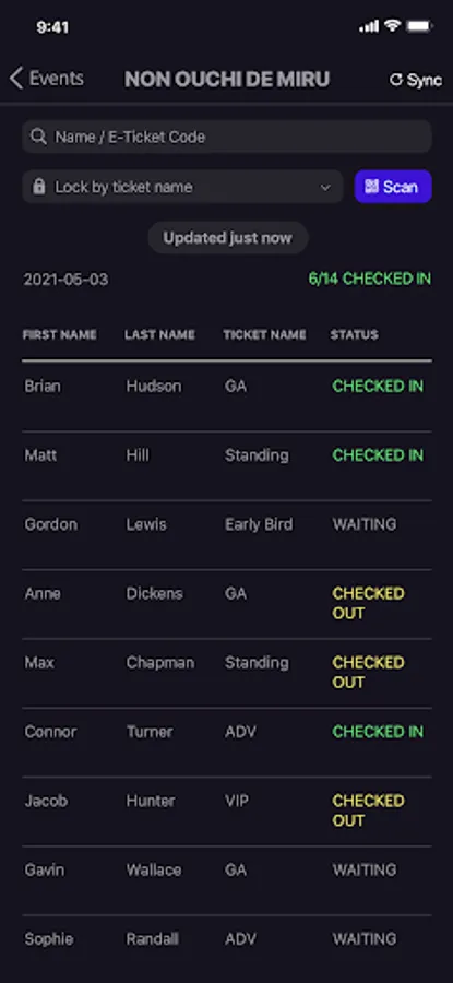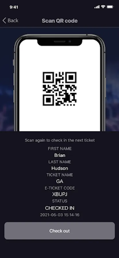 Scan in the customer's ZAIKO e-Ticket QR code using the device's rear-facing camera. When the guest does not have a QR code you can quickly search by name or ticket code.