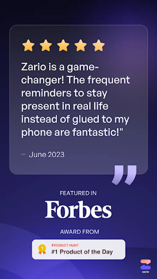 At Zario, we highly value your feedback and appreciate your 5-star rating on Google Play. Your ratings assist us in reaching more users and support YOU in reducing screen time. Share your valuable suggestions with us at feedback@meetzario.com.