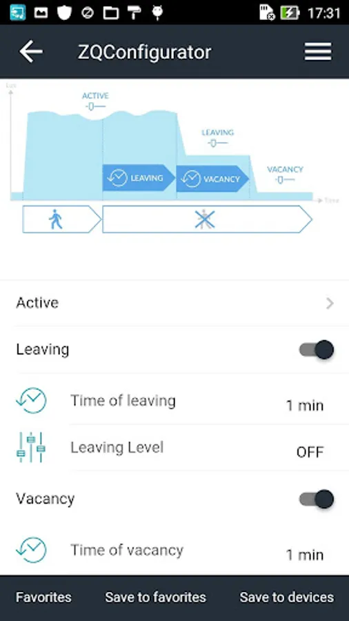 The simple and intuitive graphical interface allows you to identify and grouping the controller and sensors installed and configure the operating parameters of the working modes, such as the time-out of motion sensors and the desired lighting levels.