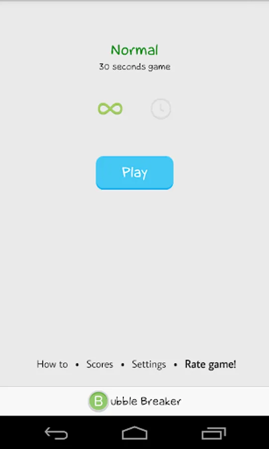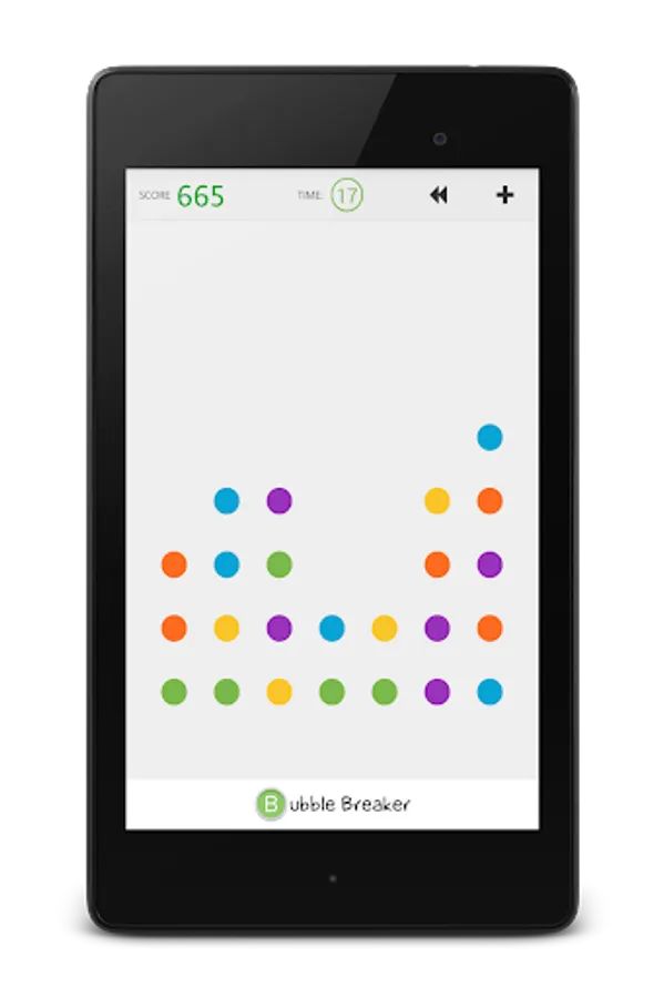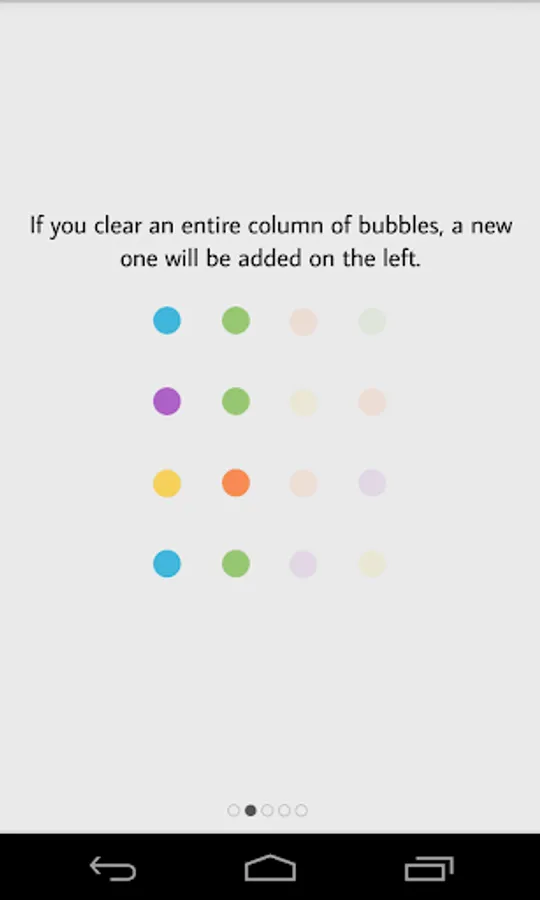 A group of bubbles consists of two or more adjacent bubbles of the same color. There are 7 bubbles per column and row. When a column is empty (all the bubbles of that column are gone), a new column is added on the left of the screen to complete the 7 columns. The game ends when there are no more groups of bubbles in the screen, or in other words, when every bubble in the screen doesn't have an adjacent bubble of the same color.