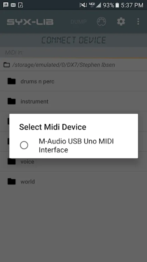 • If the device is recognized, a dialog will appear. Select a device to connect to. If you want to reopen this dialog at any time, press the MIDI menu icon.