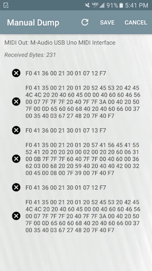 • Each SysEx message received will be displayed separately in the order they are received. Remove any individual message by pressing the "X" button next to it.
