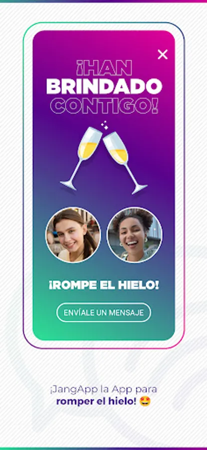 You only need to enter simple data such as your name, photo and preferences. You decide who you share a drink with and start a conversation; only two people toast when there is mutual interest. It is a simple and easy-to-use app that makes it easier for you to get closer to the people you want to meet, avoids feeling rejection and knowing when is the right time to act. You can only see and invite to match people who are in the same place on the same day. Once the establishment is closed, contact through the app will not be available. Jangapp does not sync with any other social networks to guarantee your privacy.