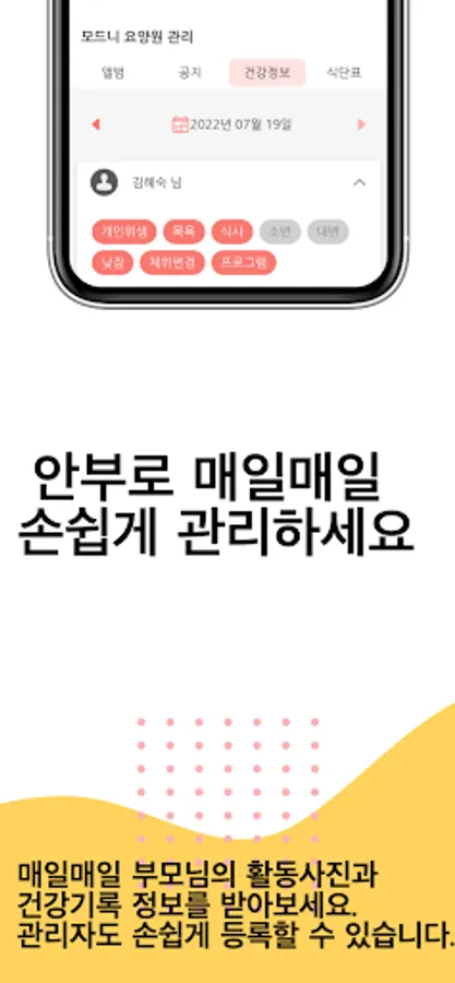 2. A perfect day in 'Goodbye'! In 5 minutes, teachers can communicate with the caregiver by uploading the patient's daily life without exposing the individual number. Now you can reduce the burden of phone work and focus on patient care.