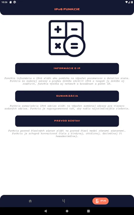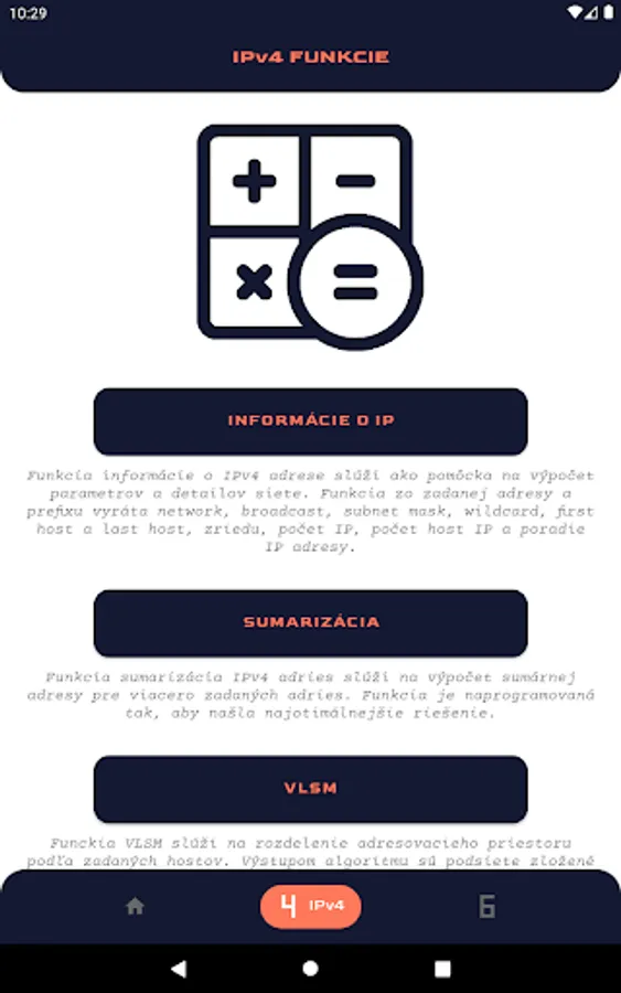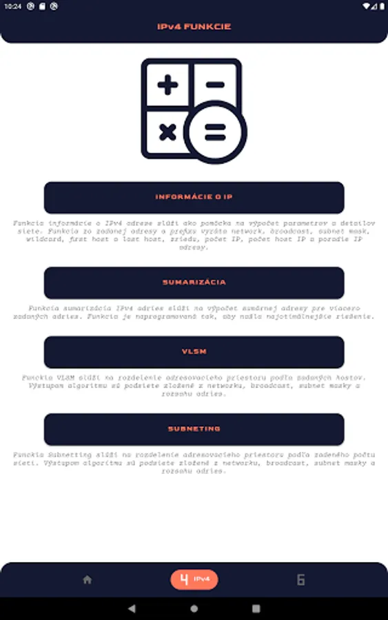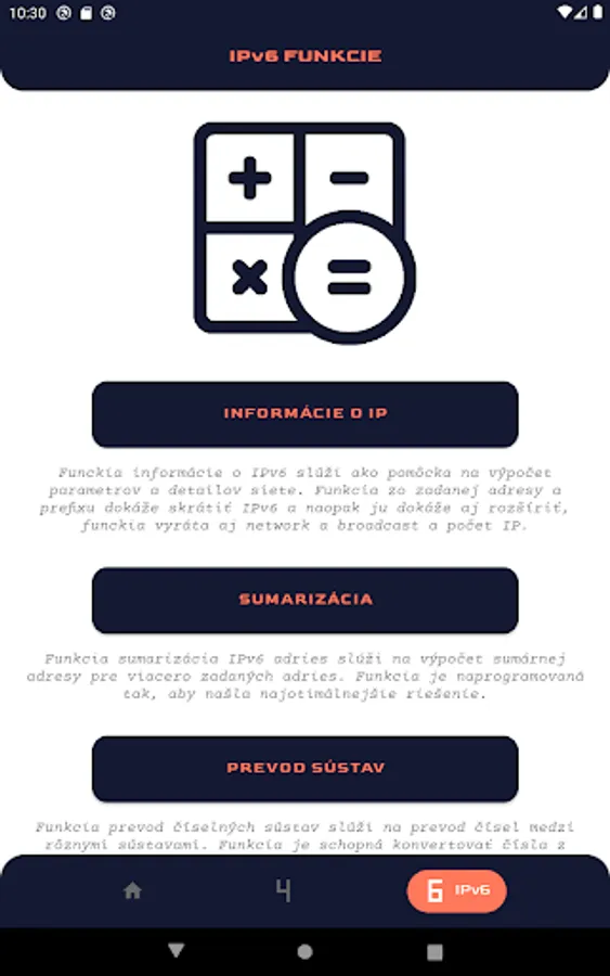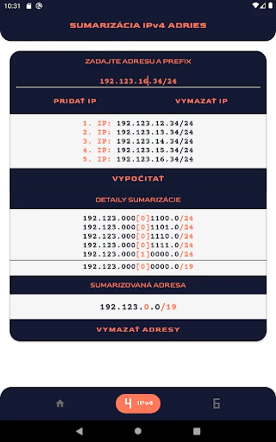 IP Calculator serves as a tool for working with IP addresses, allows the user to quickly and efficiently calculate IPv4 and IPv6 address information, summarize IPv4 and IPv6 addresses, as well as offer the ability to subnet networks using VLSM or divide the network on the same subnet, the last function system.
