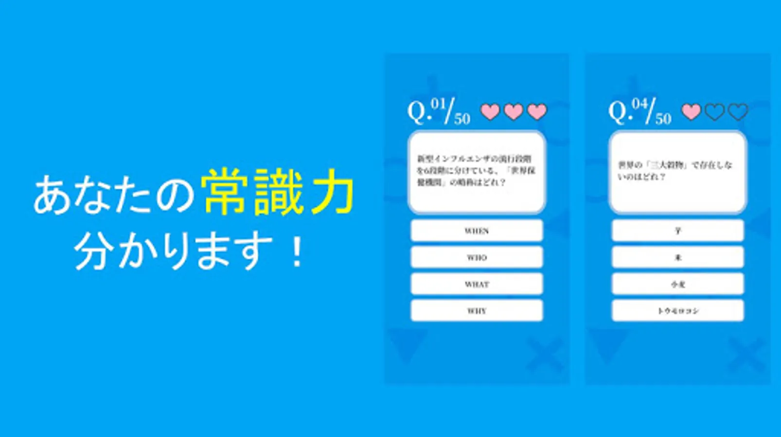 It is a quiz app with a wide range of questions from knowledge useful in everyday life to world history and culture. Play alone or compete with friends. Please download it and test your common sense.
