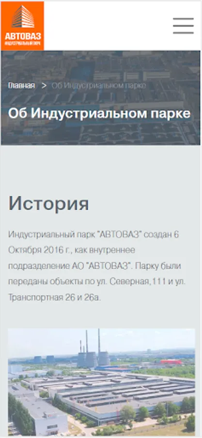 The industrial park "AVTOVAZ" was established on October 6, 2016 as an internal division of JSC "AVTOVAZ". The park was given objects along the street. Severnaya, 111 and st. Transportnaya 26 and 26a.
