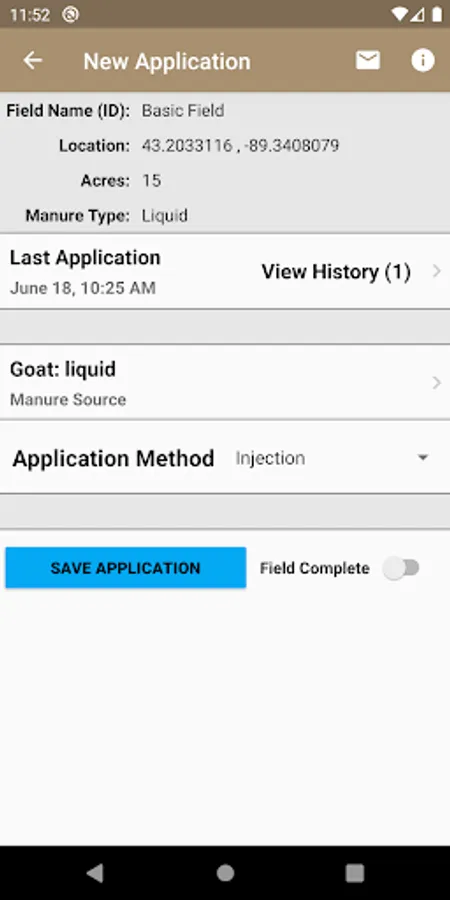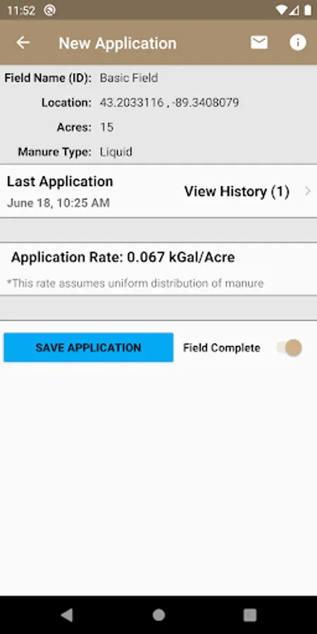 The Manure Tracker app allows you to record manure applications on a field by field basis. By creating a list of FIELD names specific to your farm, each manure application is saved to your smartphone and can be sent as a .csv file to an email address for further record management and safe keeping. This app takes advantage of your phone's GPS sensor to record the location of fields for increased organization.