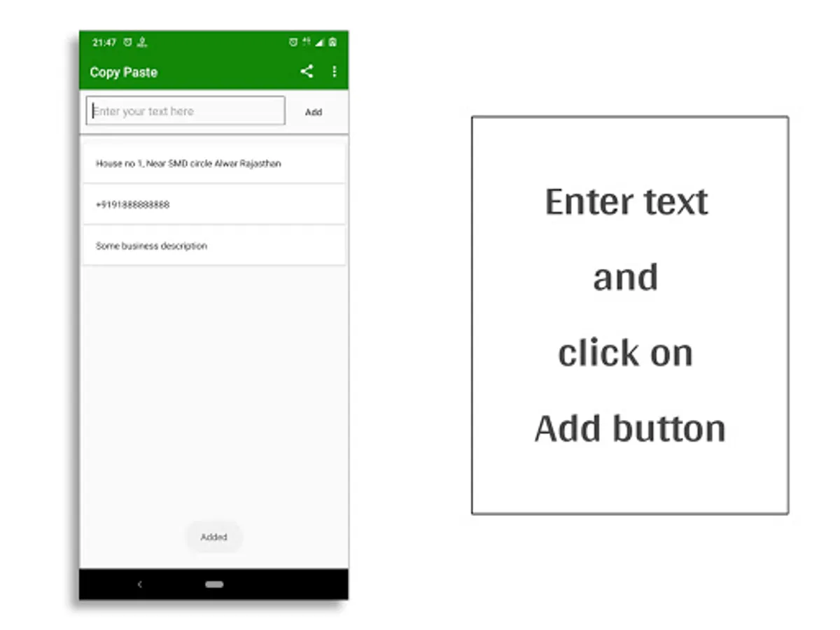 You can add text in the app once and copy it to clipboard every time you need it with single tap on your added text. No need to type same thing again and again on your mobile.