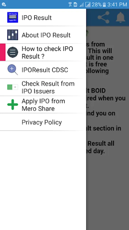 IPO Result is app for information and result publication share app for investors. It updates all IPO results when it will be published by IPO issue manager. You did not go to other places to know IPO result if you will install in your android phone. You can also find the FPO, Mutual fund and Rights share rights from this app fast and free for ever.