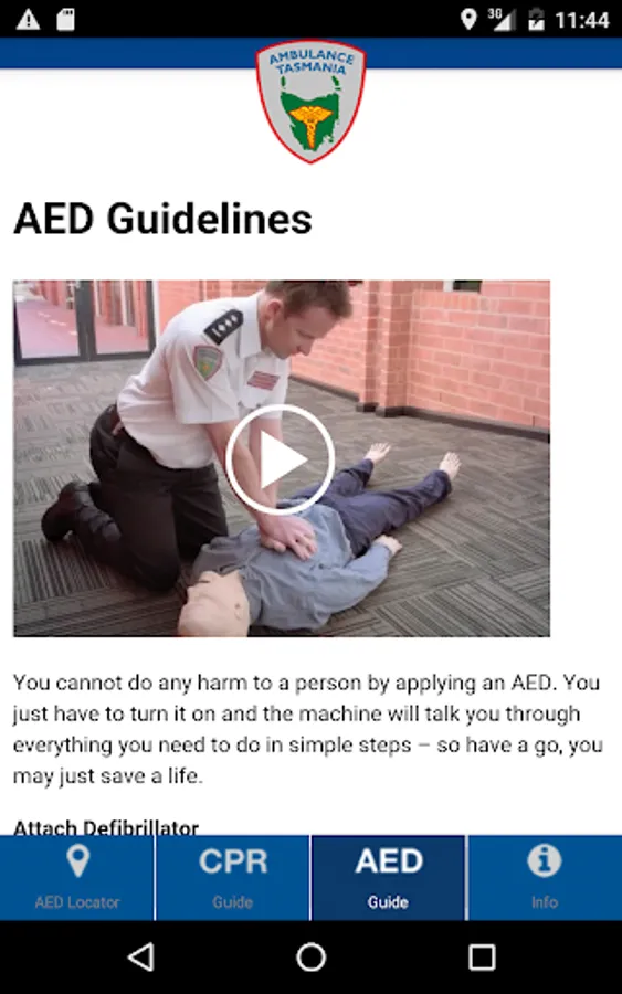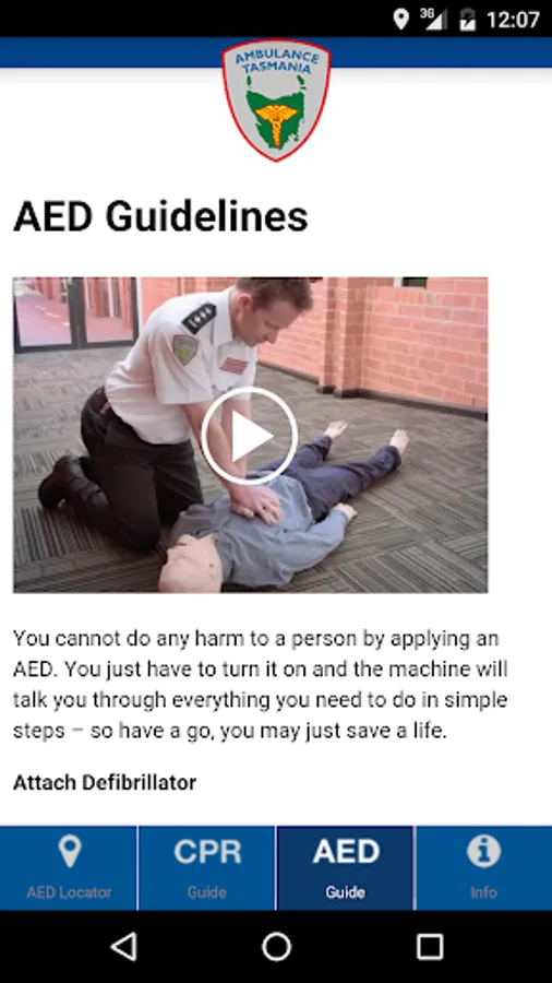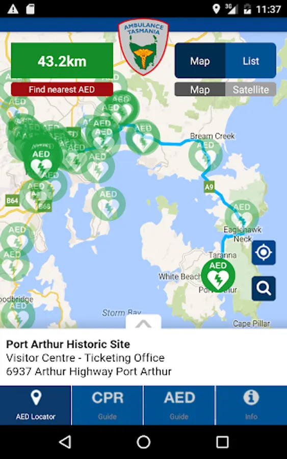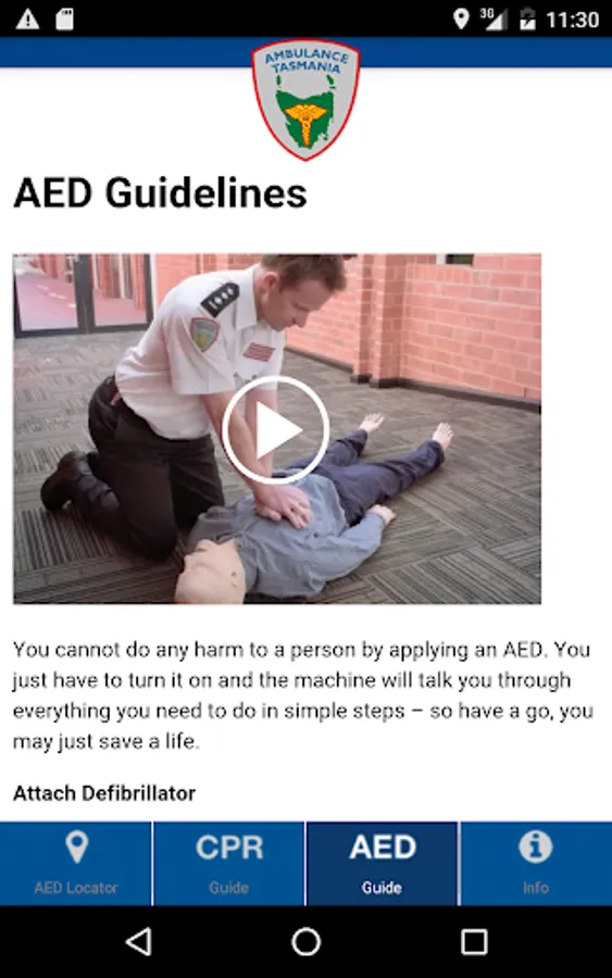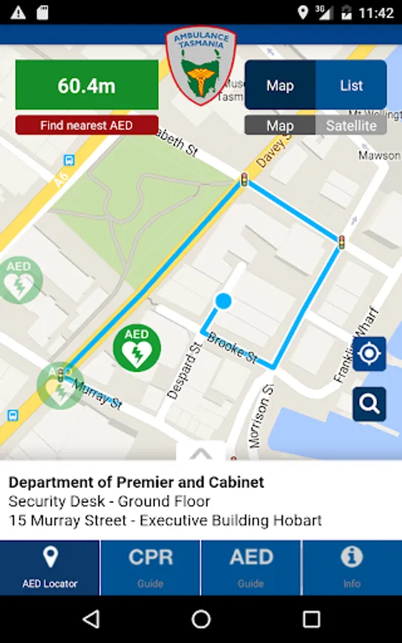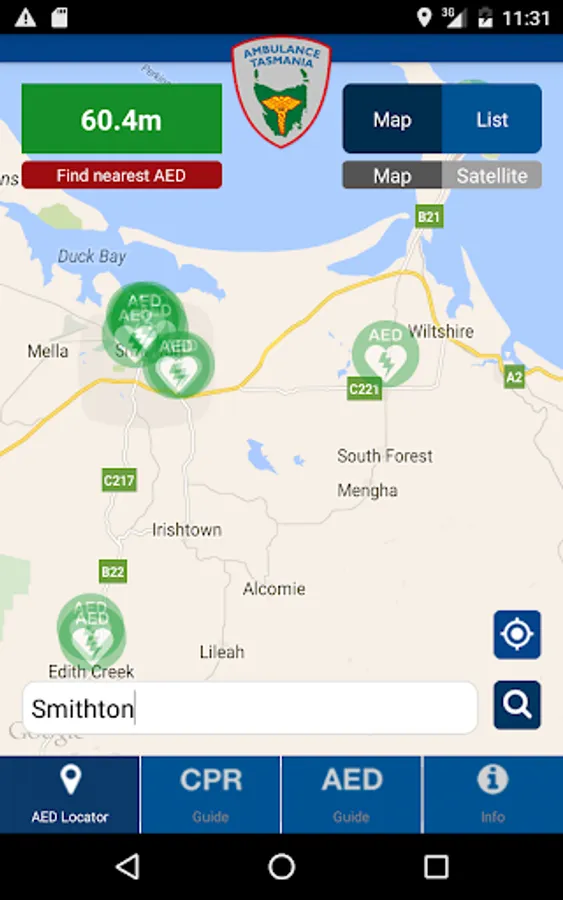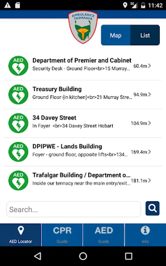 The Ambulance Tasmania AED Locator maps community held Automated External Defibrillator (AED) device locations in Tasmania. The app will use your phone’s location to determine your closest AED and display directions to that device. This app also contains an instructional video on how to use an AED and directions on how to perform CPR and manage an unconscious patient.
