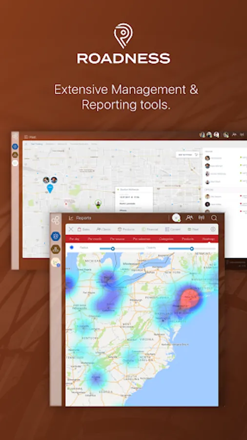 Roadness offers a fleet tracking tool to manage your drivers, salesmen or other users, simply by using their smartphone or tablet GPS, without any extra hardware. The app is optimized for low battery and data consumption.