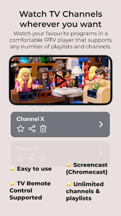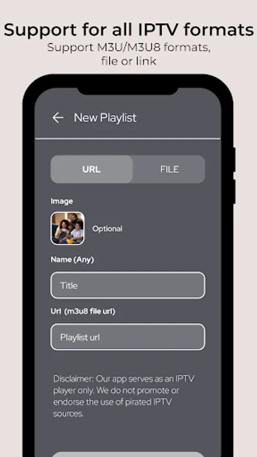 Get started in no time. Simply add your IPTV playlists from local files or URLs, and start enjoying your favorite content.