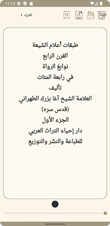 In conclusion, as we present this application to our valued users, we must extend our deep thanks, praise and appreciation to everyone who contributed to the production of this wonderful travel, and the hard work of the eminent scholar of his time in this field, Sheikh Agha Buzurk al-Tharani, may God have mercy on him, who worked on its typesetting, and interviewed him And printing it on paper, and realizing some of its parts, and those who saved us a written copy and published it to be available to researchers (the zakat of knowledge was published), and to the dear brothers who spared no effort in making this application, may God reward them all with the best reward for the benefactors.