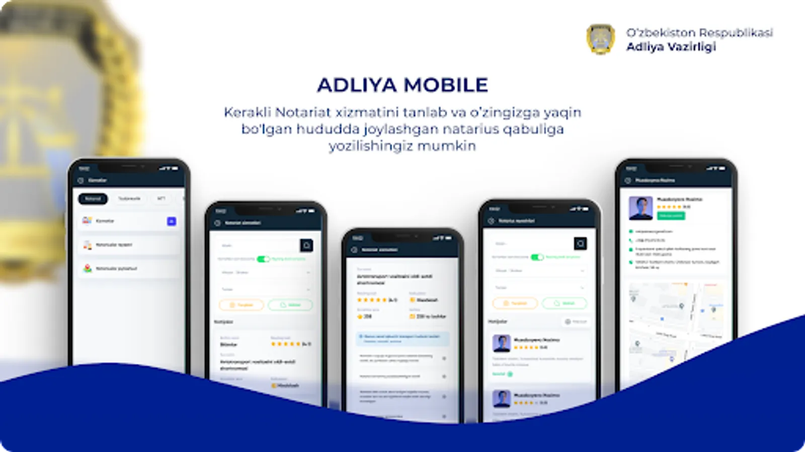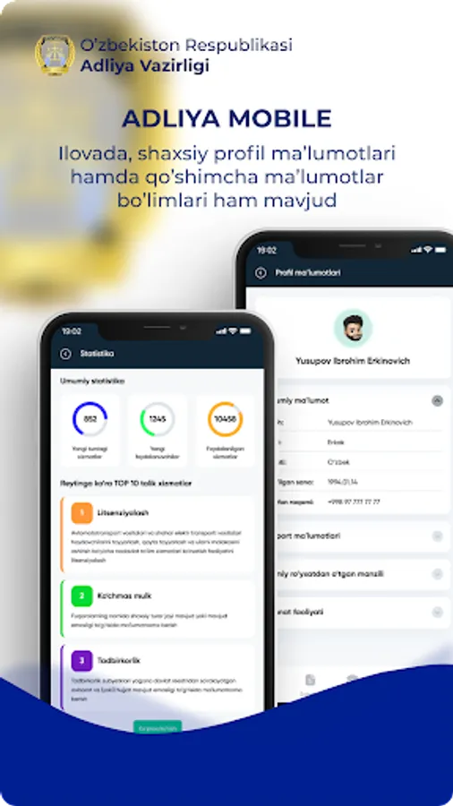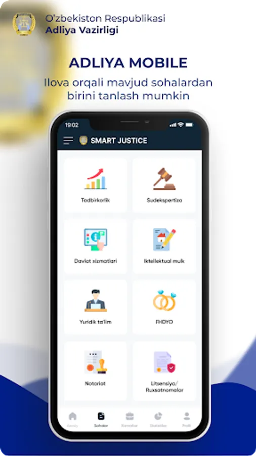 “Adliya mobile” мобил иловаси орқали - Адлия адлия органлари ва муассасалари ҳамда Давлат хизматлари марказлари томонидан кўрсатиладиган айрим турдаги давлат хизматларидан фойдалинш мумкин.