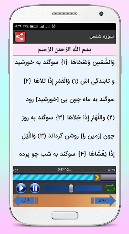 ✔ Possibility to change the text size of the verses of the Holy Quran
