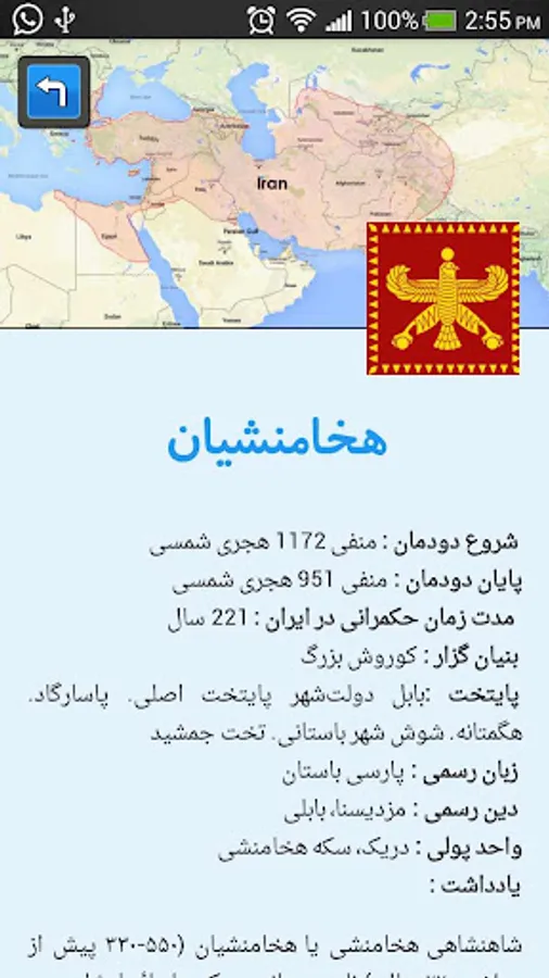 * Complete explanations of each dynasty, which include: name, time of the beginning of the rule, time of its end, flag, territory of Iran at that time, official language, official religion, founder, capital, currency and ....
