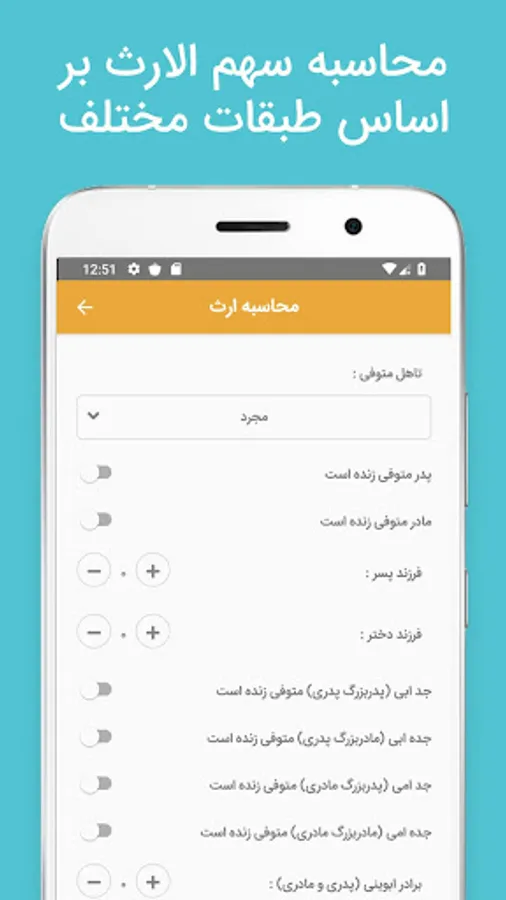 Calculating the share of inheritance of different classes of heirs and couples by considering the modes of hijab and displaying the share of each heir - as a fraction and percentage, and if the user wishes, displaying the share in Rials as well as selecting the display of fractions as a common denominator