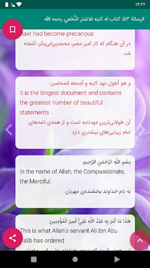 In the current program,Seyed Alireza's translation has been used for English translation and Dr. Shahidi, Ayatollah Makarem, Dr Ayati, Ansarian,Feizolislam and Dashti's translations and Dr. Ghaemi's Nahjol- Balagha interpretation have been used for Persian translation.
