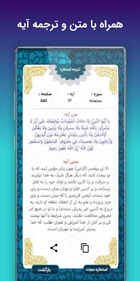 - Separation of surah, verse and page number of Quran along with the text and meaning of the desired verse