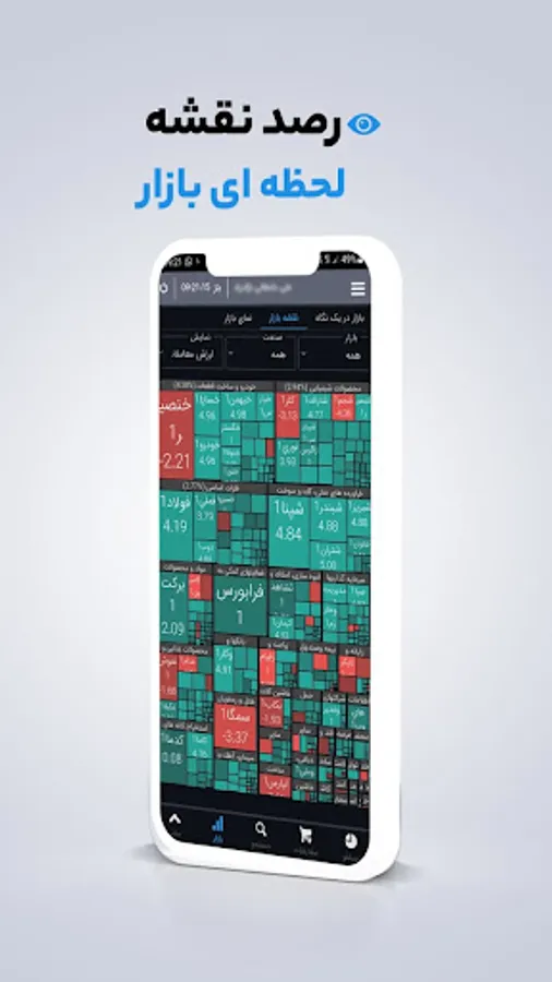• نمایش نقشه بازار با قابلیت فیلتر براساس حجم و ارزش معاملات، بازار و گروه صنایع