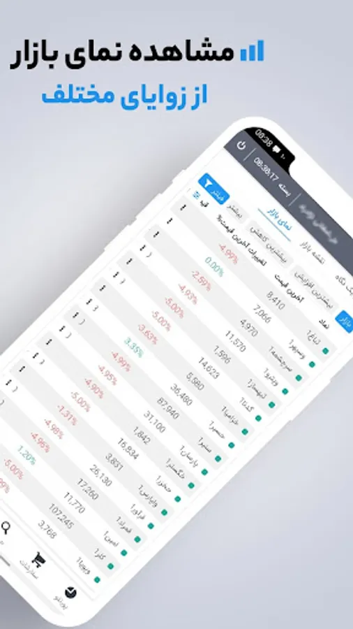 • مشاهده نمای بازار با بهره گیری از اطلاعات جامع نمادها و دارای قابلیت فیلترنویسی