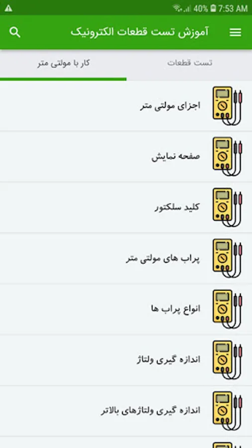 Constant resistance / LDR resistor / PTC resistor / NTC resistor / Potentiometer / Volume / Capacitor / Inductor / Transistor / Darlington transistor / Transistor UJT / Triac / Diode / Reverse diode / Zener diode / Bridge diode / Optical diode / LED / MOSFET / Speaker / Microphone
