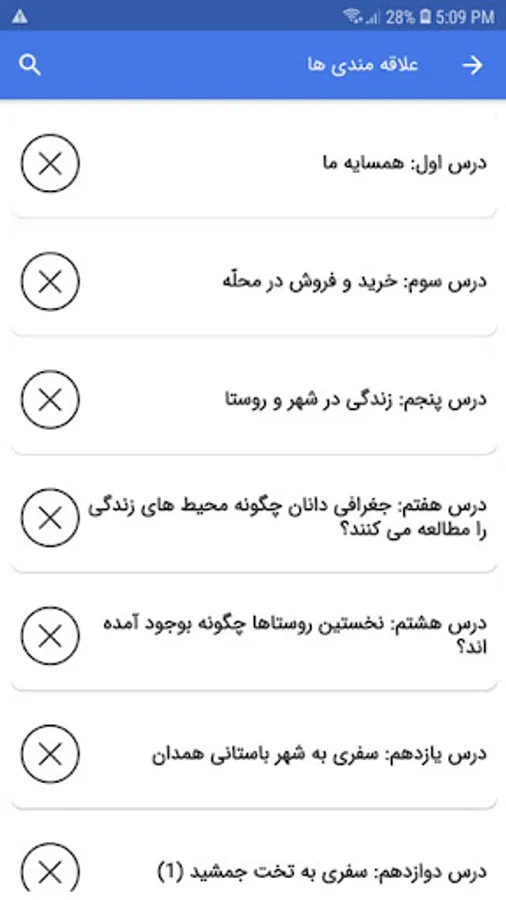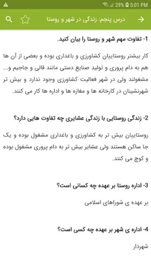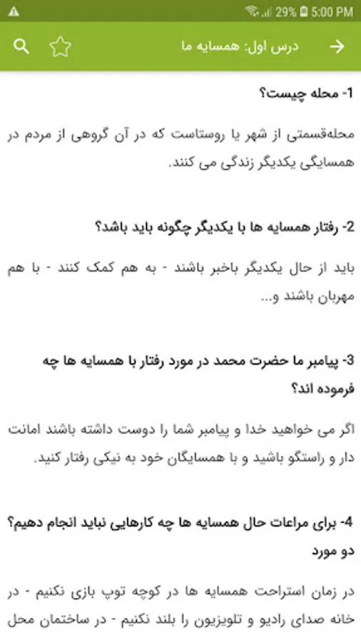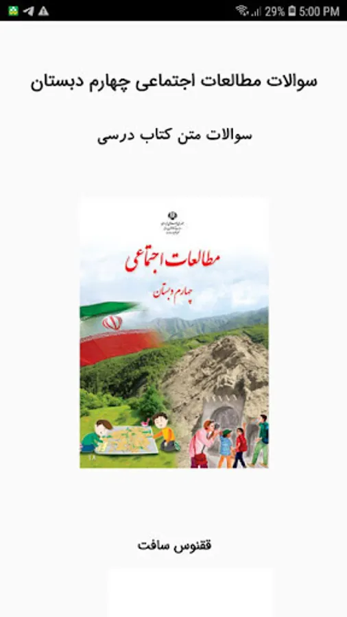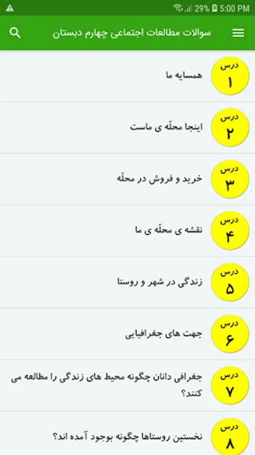 Our Neighbor / This is our neighborhood / Buying and selling in the neighborhood / Map of our neighborhood / City and village life / Geographical directions / How geographers study living environments / How the first villages came into being / The first cities How did they come into being / How do historians study the past? / A trip to the ancient city of Hamedan / A trip to Persepolis (1) / A trip to Persepolis (2) / A trip to the ancient city of Kermanshah / Beautiful mountains and plains / Climate / Climate areas of Iran / Vegetation and life Animal in Iran / Take care of the environment / Our national symbols / Calendar / Important days