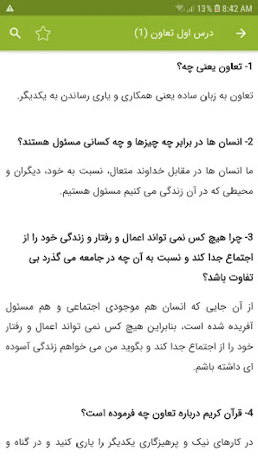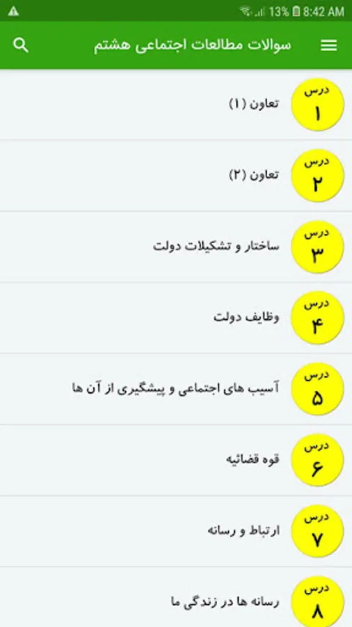 تعاون (1) / تعاون (2) / ساختار و تشکیلات دولت / وظایف دولت / آسیب های اجتماعی و پیشگیری از آن ها / قوه قضائیه / ارتباط و رسانه / رسانه ها در زندگی ما / ظهور اسلام در شبه جزیره عربستان / رحلت پیامبر تا قیام کربلا / ورود اسلام به ایران / عصر طلایی فرهنگ و تمدن ایرانی-اسلامی / غزنویان، سلجوقیان و خوارزمشاهیان / میراث فرهنگی ایران در عصر سلجوقی / حمله چنگیز و تیمور به ایران / پیروزی فرهنگ بر شمشیر / ویژگی های طبیعی آسیا / ویژگی انسانی و اقتصادی آسیا / ویژگی های منطقه جنوب غربی آسیا / ویژگی های طبیعی و انسانی اروپا / ویژگی های طبیعی و انسانی آفریقا / قاره آمریکا / قاره استرالیا و اقیانوسیه