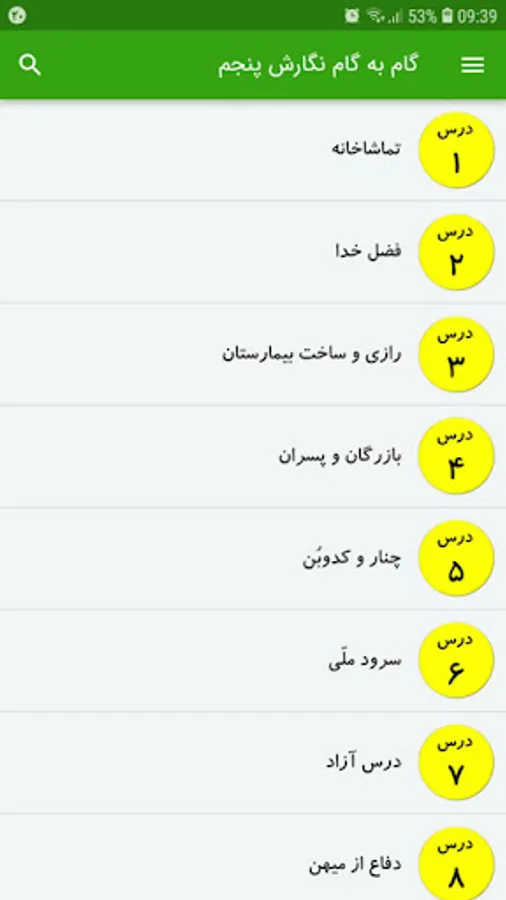 Tamashakhane/ God's grace/ Razi and building a hospital/ Merchants and boys/ Sycamores and pumpkins/ National anthem/ Defense of the motherland/ Name bearers of yesterday, today and tomorrow/ Good name/ The role of the wise/ The day it rains/ Courage/ Kajestan/ When Bu Ali was a child/work and effort