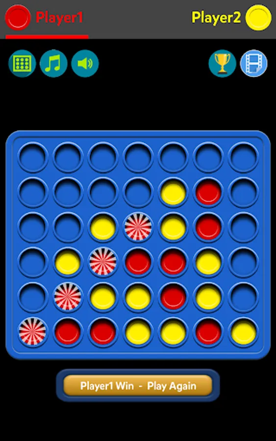 Four in a row or Four in a line is a two-player connection game like Tic Tac Toe in which the players first choose a color and then take turns dropping one colored disc from the top into a seven-column, six-row vertically suspended grid. The pieces fall straight down, occupying the next available space within the column. The objective of the game is to be the first to form a horizontal, vertical, or diagonal line of four of one's own discs.