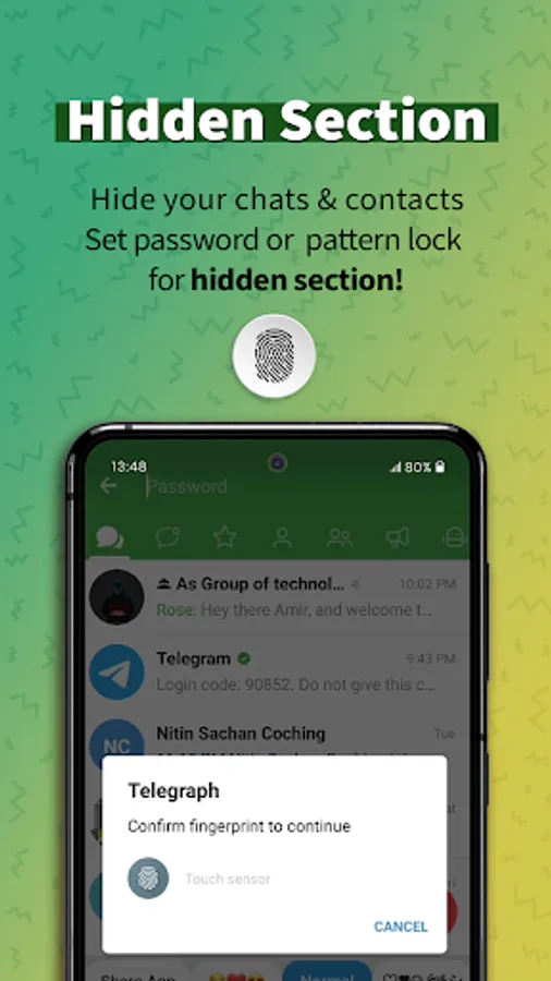 +Hidden section, hide your chats and contacts and set password or pattern lock for them.