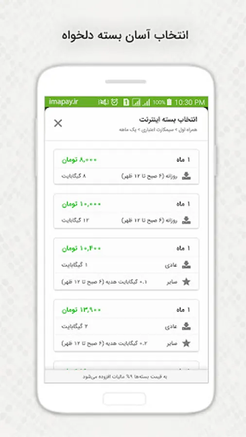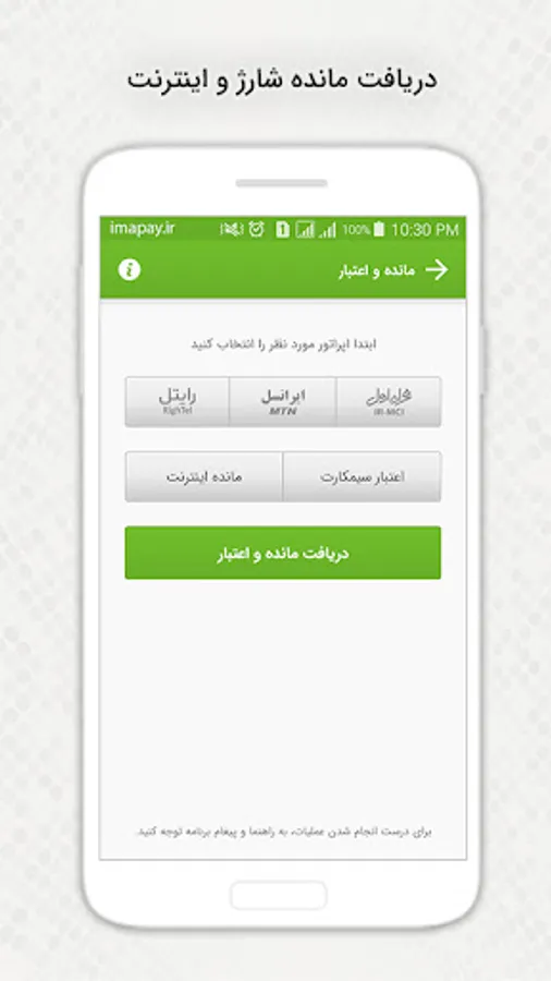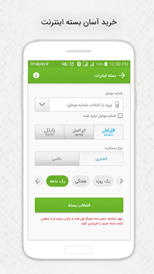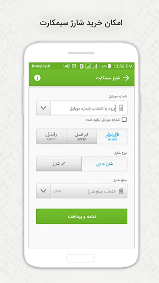 + Direct purchase of recharge for Irancell SIM cards, Hamrah Aval, Rytl.