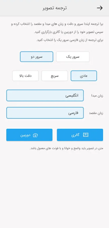 Image translation consists of two separate servers, each of which has adjustable translation accuracy. With this feature, you can easily extract the texts in the images and translate them.