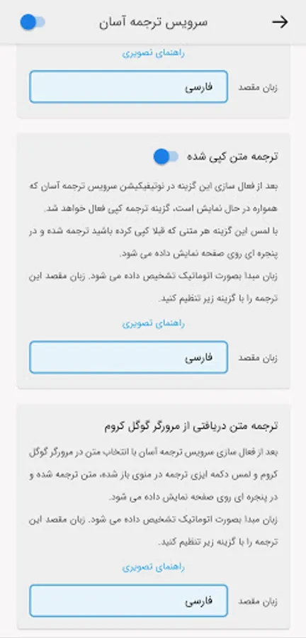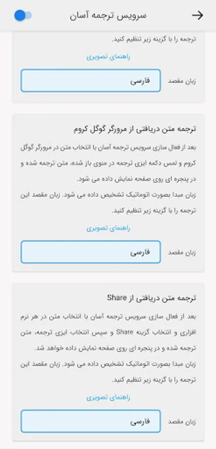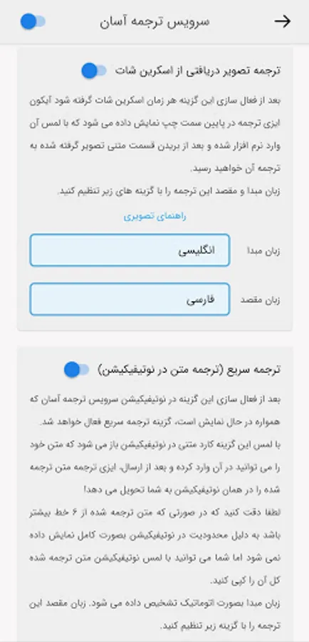 With the fast translation service, you can easily translate your text without opening any software and only through notifications! (Depends on Android version)