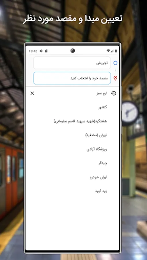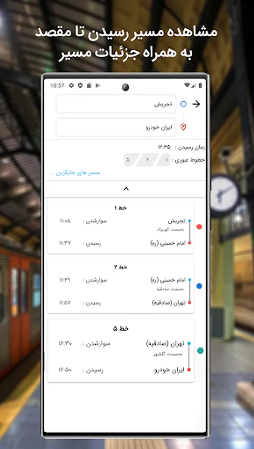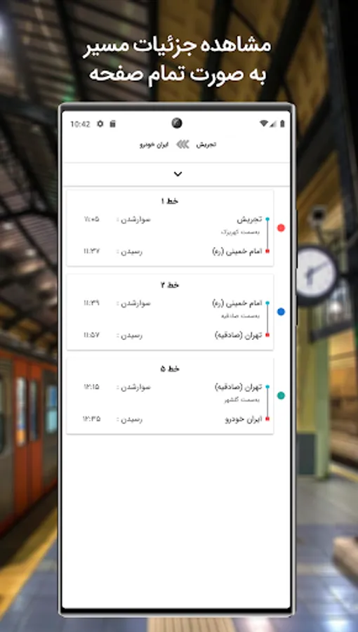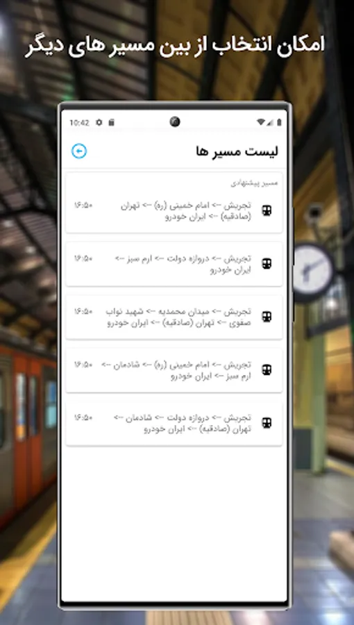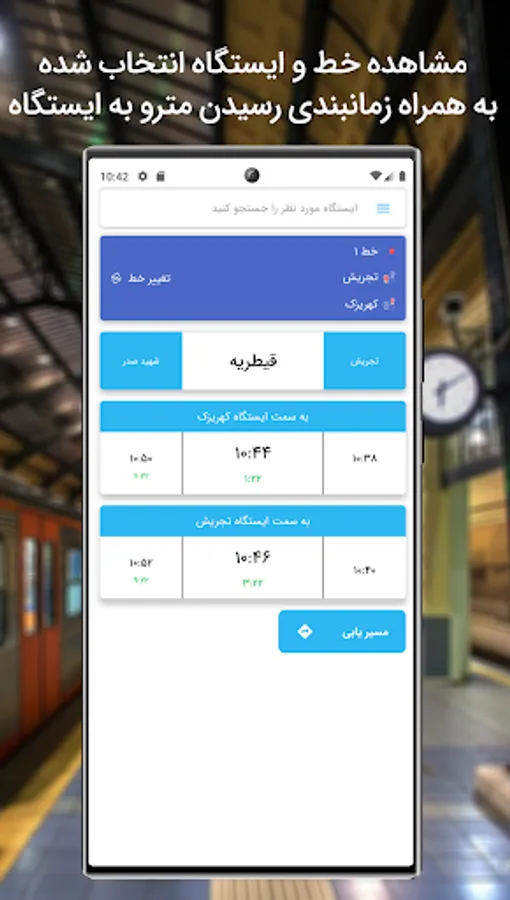 In this regard, after receiving your location, it offers you the nearest metro station and at the same time shows you the nearest metro departure time from that station, as well as the next and previous hours with the counter.