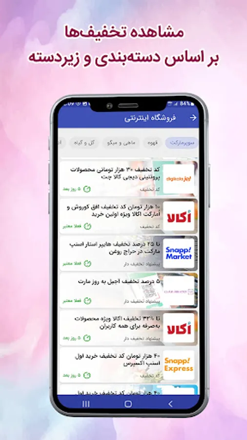coupon shopping from Digikala , Okala , Snappmarket , Modiseh , 7mive and ...