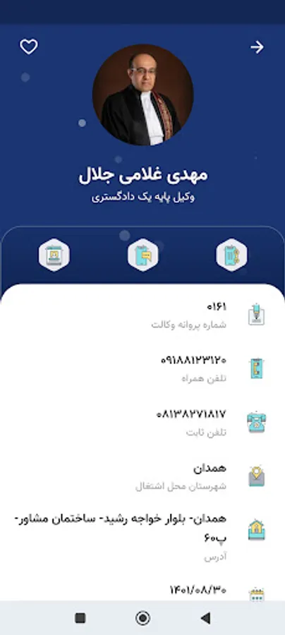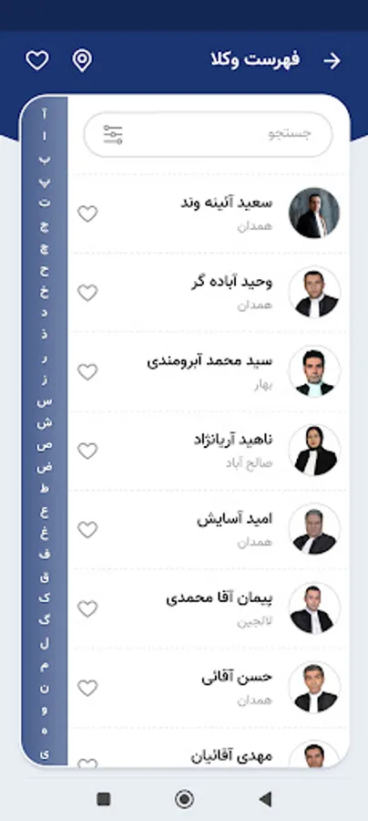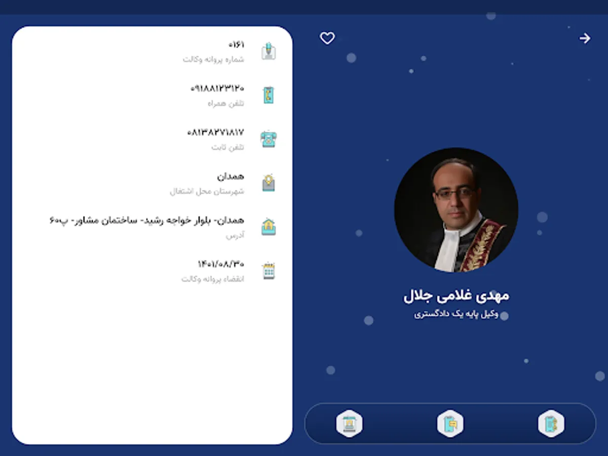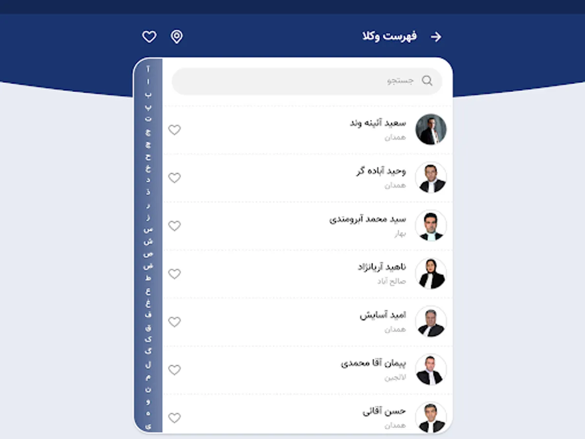 This application was designed and produced in order to facilitate people's access to the lawyers of their province and at the request of the Hamadan Lawyers' Association and is available to you dear ones. Using this application, you can find the lawyer you want and access them through their details, such as address, mobile phone, landline, etc.