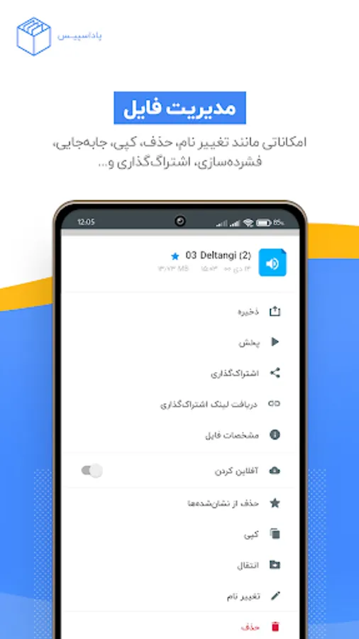 •با فضای ذخیرهسازی ابری پاداسپیس، عکسها، اسناد و فایلها را بر روی فضای ابری آپلود و در هرکجا و روی هر دستگاه آنها را دانلود و مدیریت کنید.