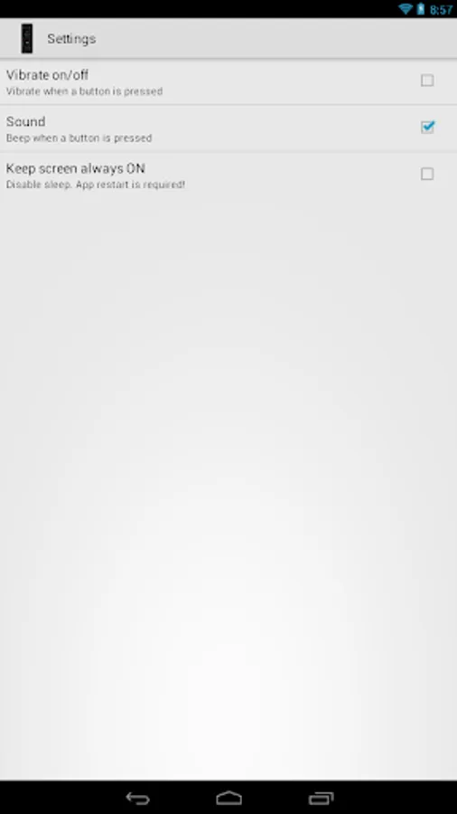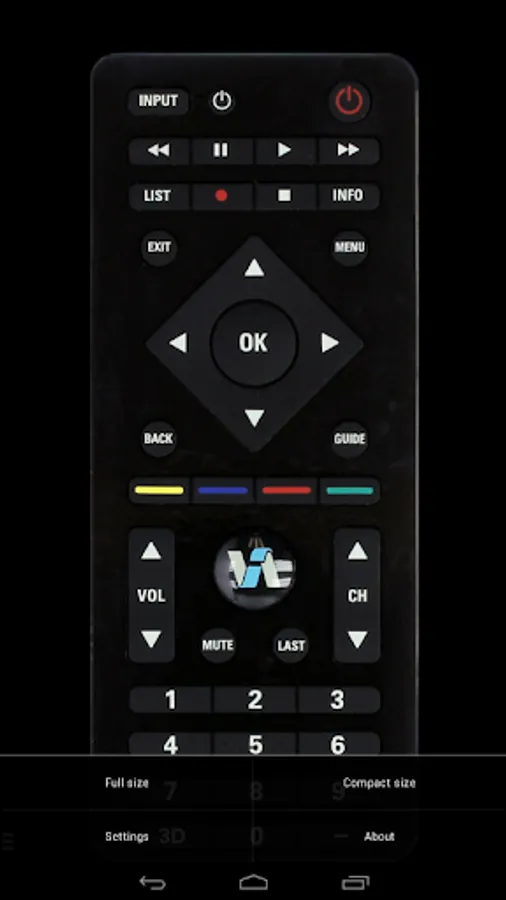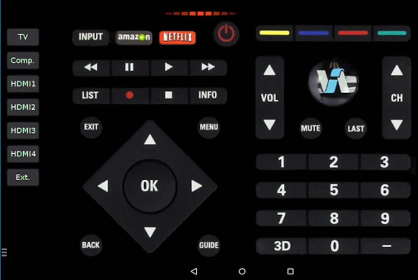 This is simple unofficial infrared remote control app for Vizio TV. It works with phones and tablets with built-in IR blaster (Galaxy S4 , S4 mini , Active , Zoom, S5, Note 3, Note 8.0, 10.1, Galaxy Tab (not all), some HTC and LG phones with >4.4.2). The purpose is not to replace the original remote. This app is handy in emergency situations (original remote is lost, empty batteries etc).