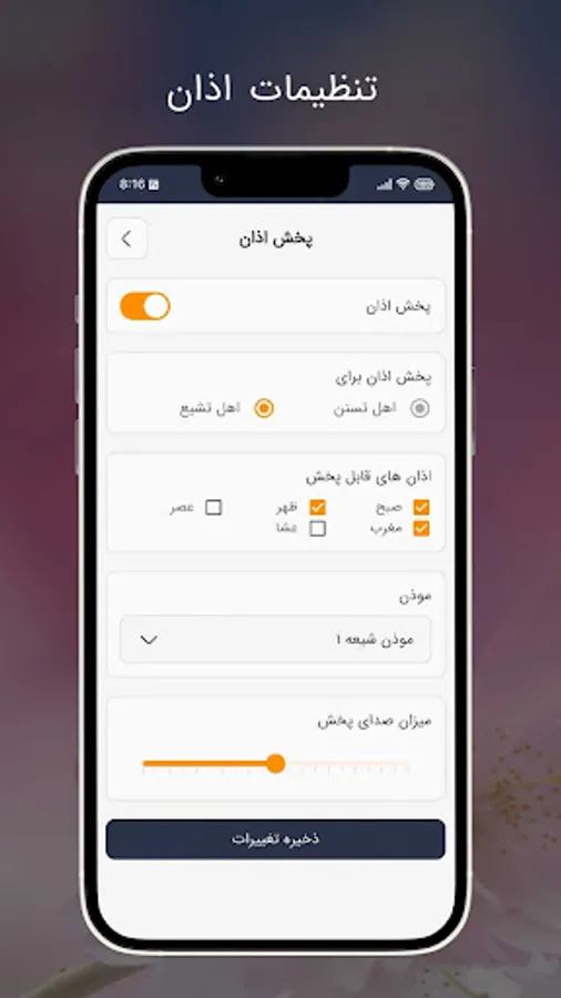 1- Azan broadcast with the ability to customize for Shiites and Sunnis and the ability to localize with the Geophysics Center of Tehran University.
