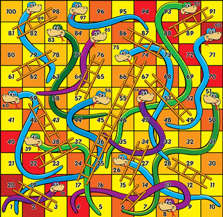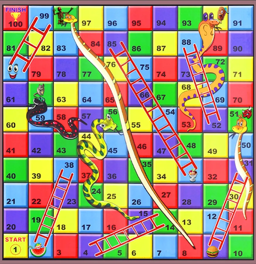 Snakes and Ladders is an ancient Indian board game regarded today as a worldwide classic. It is played between two or more players on a gameboard having numbered, gridded squares. A number of "ladders" and "snakes" are pictured on the board, each connecting two specific board squares. The object of the game is to navigate one's game piece, according to die rolls, from the start (bottom square) to the finish (top square), helped or hindered by ladders and snakes respectively.