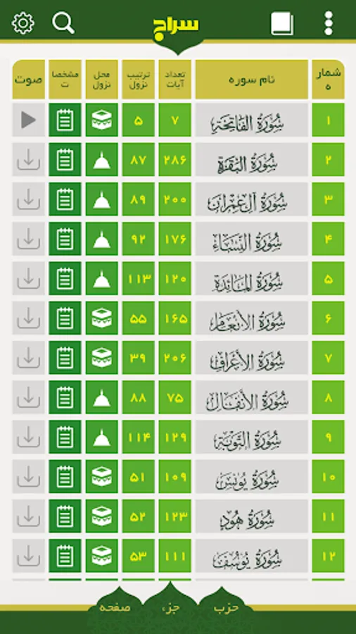 - Ability to search Sura, verse, the text and translation and interpretation of the Qur'an