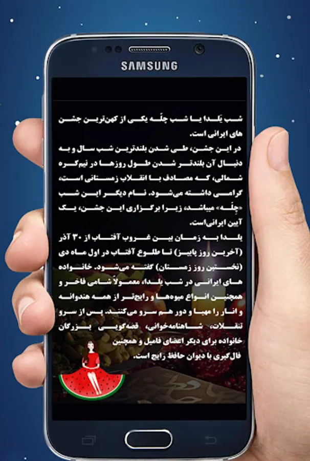 Yalda refers to the time between sunset from December 5 (the last day of autumn) to sunrise on December 1 (the first day of winter). At Yalda Night, Iranian families usually serve fine dinners as well as all kinds of fruits and most commonly watermelons and pomegranates. After serving snacks, Shahnameh reading, family storytelling is common to other family members as well as courtesy of the Hafiz Divan.