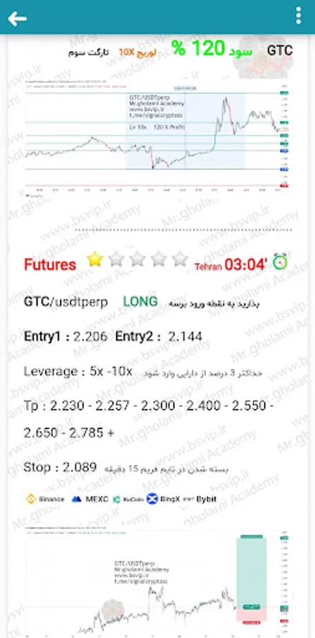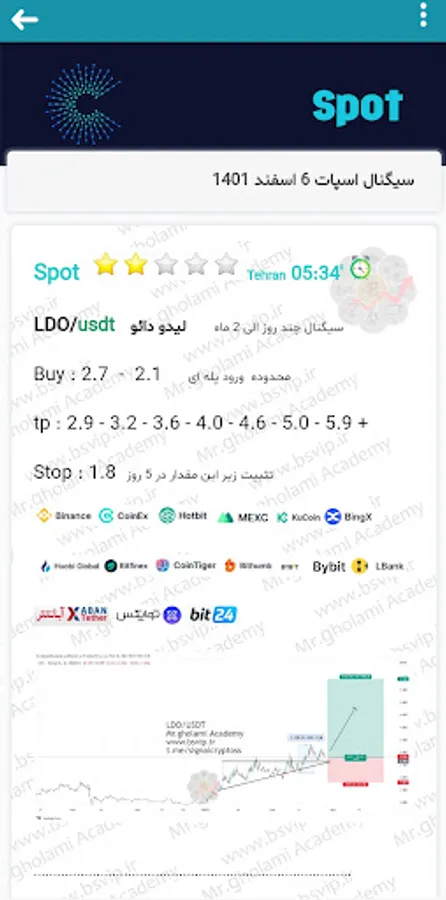 Our signals are included in this application and they are prone to growth, they are called futures, spot, pumpy, and hold, we have signals every day, the entry points of the buy and exit range and targets are included, the loss limit is included, the holding period is included, the strength of the signal is marked with an asterisk, it is also included, and most importantly, the names of the exchanges that have that currency are also included next to it.