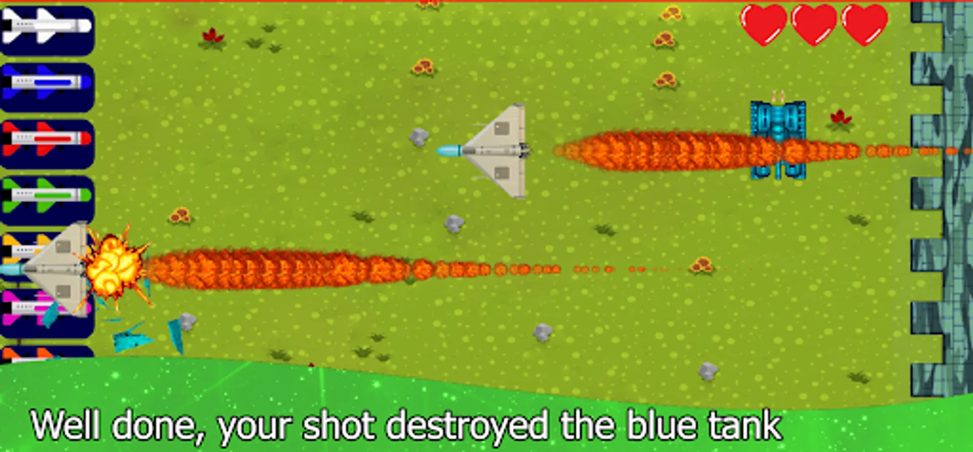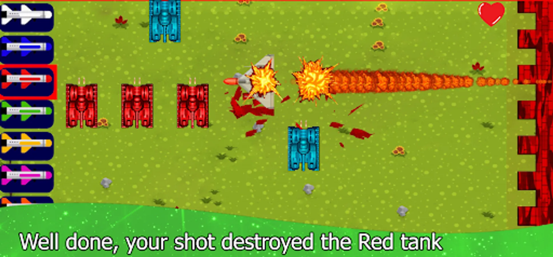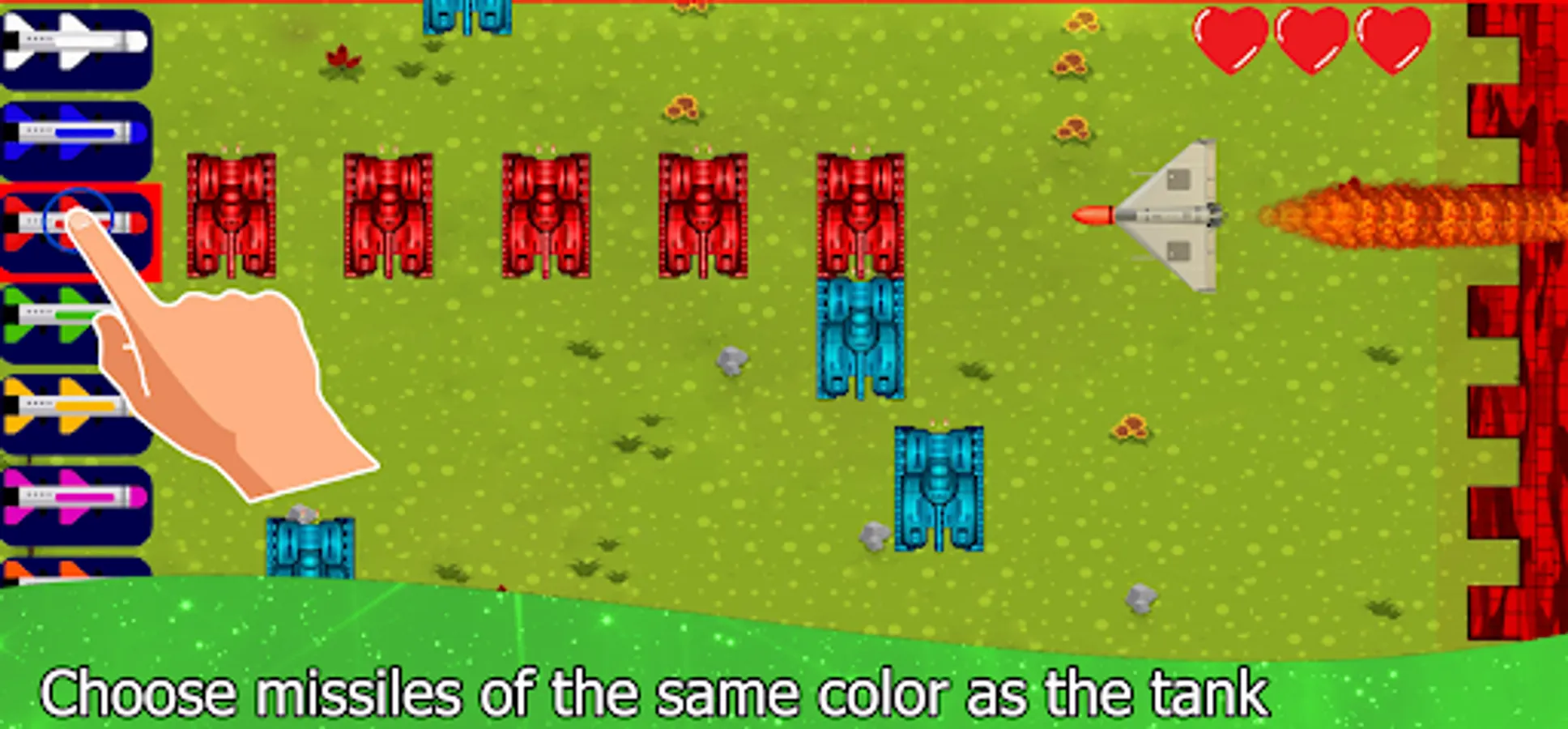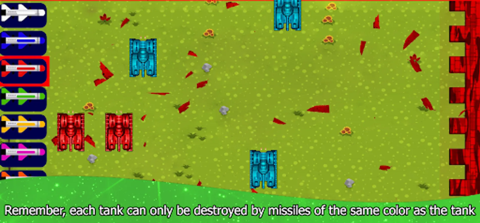 You should pay attention to the fact that each tank can only be destroyed with a missile of the same color as the tank, select the missiles on the left side of the screen and shoot the enemy tanks relentlessly.