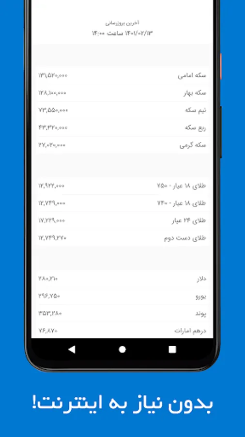 You do not need internet to use the application! Without internet, the latest prices sent to your phone will be displayed. Updated prices are automatically received whenever you go online.