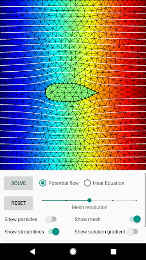 Then select the type of problem you want to solve, potential flow or heat transfer, and hit 'Solve' to compute and visualize the solution.